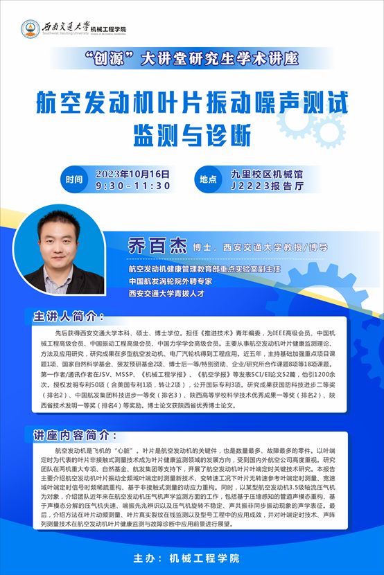 主讲人简介:乔百杰,博士,西安交通大学教授/博导,航空发动机健康管理教育部重点实验室副主任,中国航发涡轮院外聘专家,入选西安交通大学青拔人才。先后获得西安交通大学本科、硕士、博士学位。担任《推进技术》青年编委,为IEEE高级会员、中国机械工程高级会员、中国振动工程高级会员、中国力学学会高级会员。主要从事航空发动机叶片健康监测理论、方法及应用研究,研究成果在多型航空发动机、电厂汽轮机得到工程应用。近五年,主持基础加强重点项目课题1项、国家自然科学基金2项、装发预研基金2项、博士后一等/特别资助、企业/研究所合作课题8项等18项课题。第一作者/通讯作者在JSV、MSSP、《机械工程学报》、《航空学报》等发表SCI/EI论文52篇,他引1200余次。授权发明专利50项(含美国专利1项,转让2项),公开国际专利3项。研究成果获国防科技进步二等奖(排名2)、中国航发集团科技进步一等奖(排名3)、陕西高等学校科学技术优秀成果一等奖(排名2)、陕西省技术发明一等奖(排名4)等奖励。博士论文获陕西省优秀博士论文。